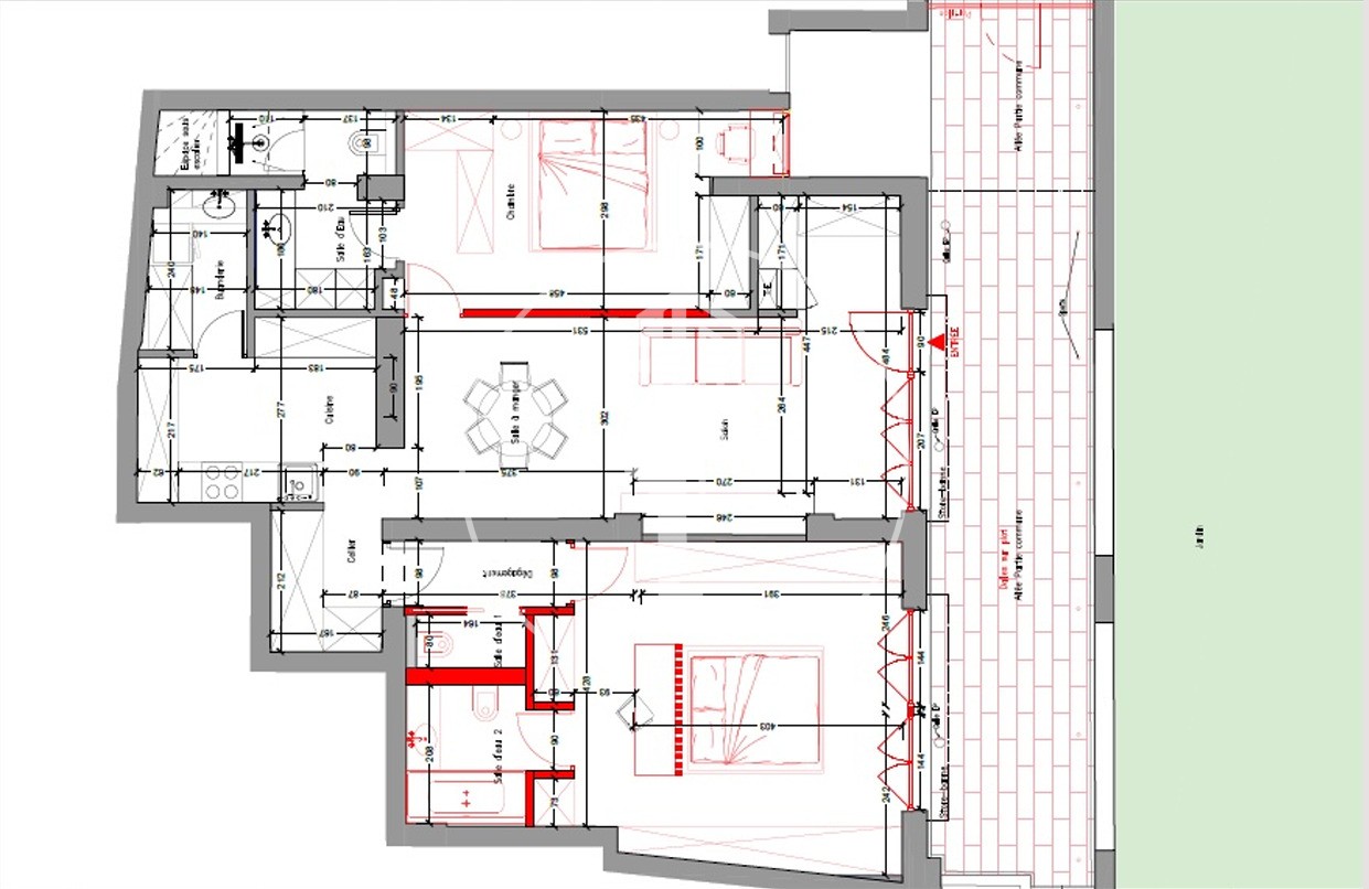 CARRE d'OR - In a residence with concierge service, this apartment of approximately 190 m2, completely renovated, consists of an entrance, a living room, a kitchen, two master bedrooms with bathroom, a dressing room and a guest toilet. The living room and bedrooms open onto a large terrace out of sight.