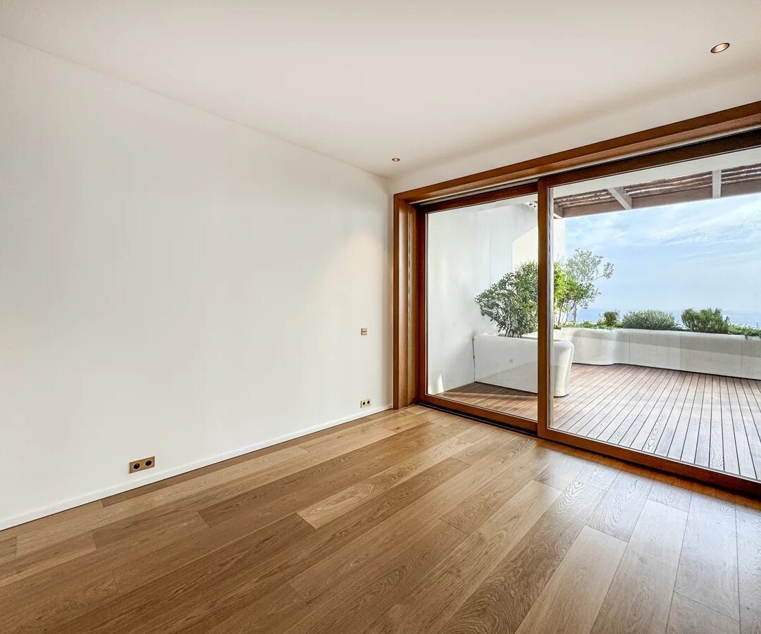 The apartment has a spacious terrace offering stunning panoramic sea views.