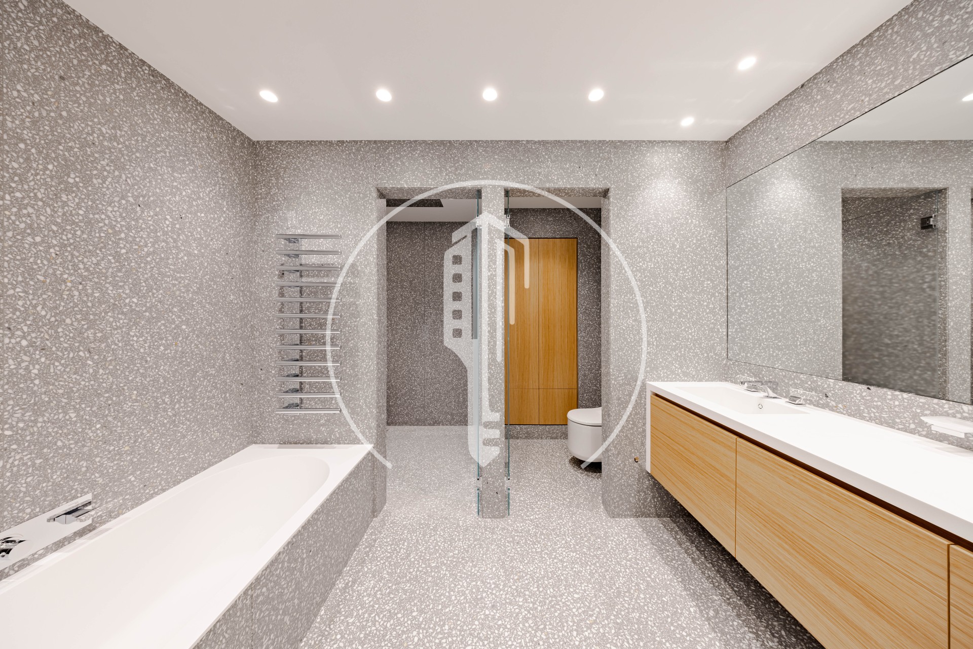 The apartment also includes an independent kitchen, a laundry room, guest toilets and toilets for the staff.