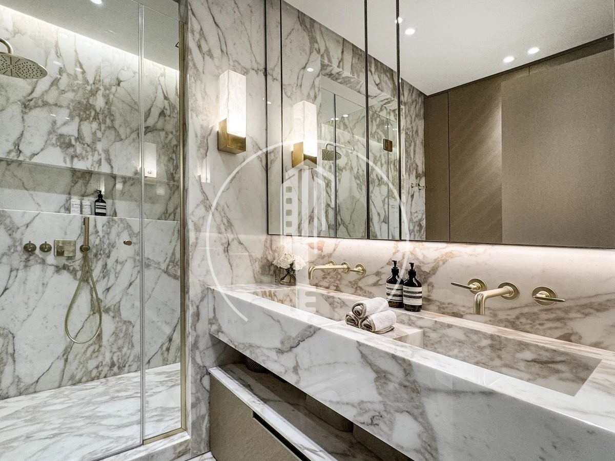 The master bedroom exudes discreet refinement and a carefully curated design. It opens onto a generous, elegantly appointed walk-in dressing room. An adjoining room with a beautifully integrated desk creates a luxurious, serene, and highly functional workspace. The bathroom, designed in warm marble tones, offers the highest level of comfort and an exclusive atmosphere.